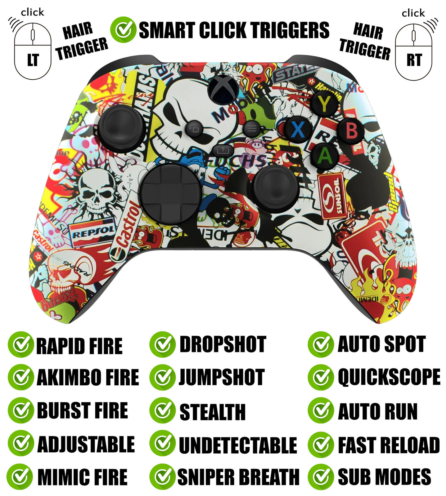 Sticker Bomb Silent Modz Smart Click Triggers Modded Controller for Xbox & PC